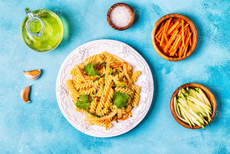 Паста фузилли с кальмарами, цукини и морковью