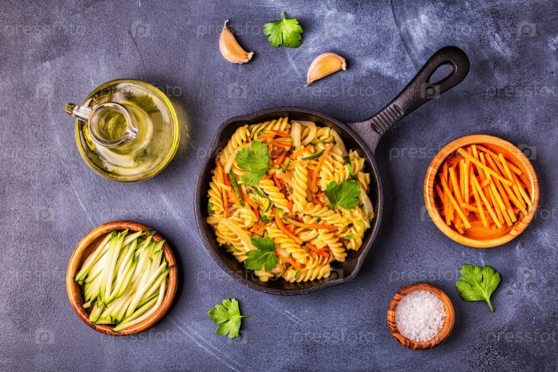 Паста фузилли с кальмарами, цукини и морковью