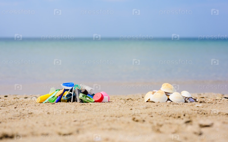 Куча мусора рядом с кучей красивых ракушек на фоне моря. Сравнение продуктов жизнедеятельности человека и природы. Концепция охраны окружающей среды