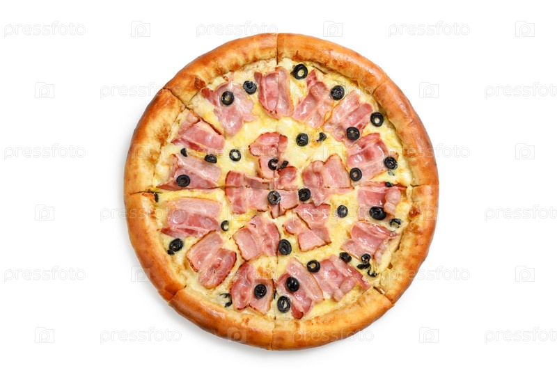 Пицца с беконом и оливками на белом фоне. Вид сверху