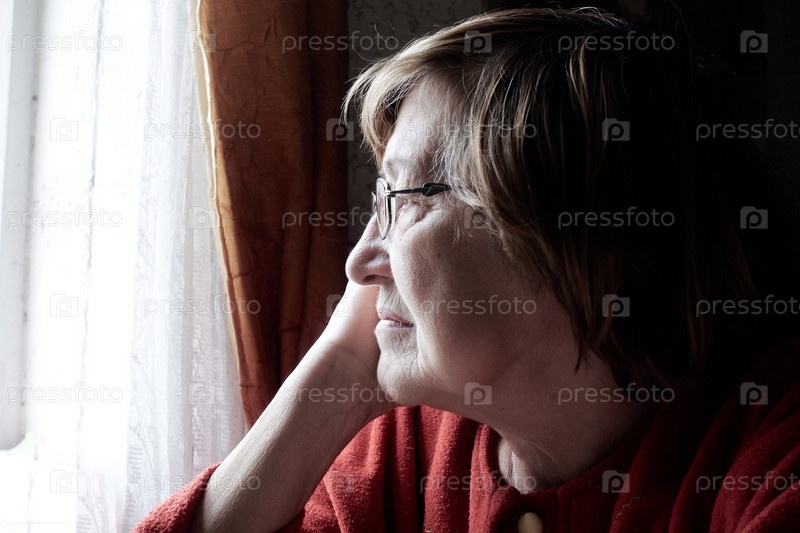 Грустная бабушка в очках уныло и задумчиво смотрит в окно на улицу из деревенского дома