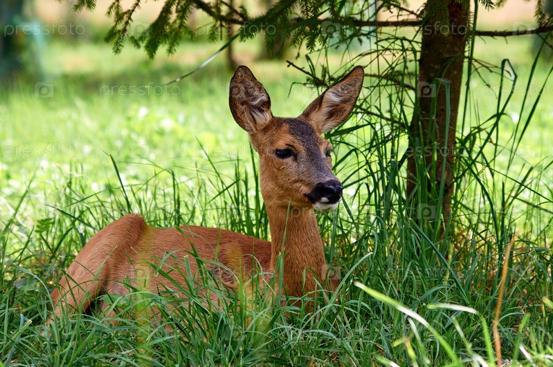 Олененок лежит в траве под деревом