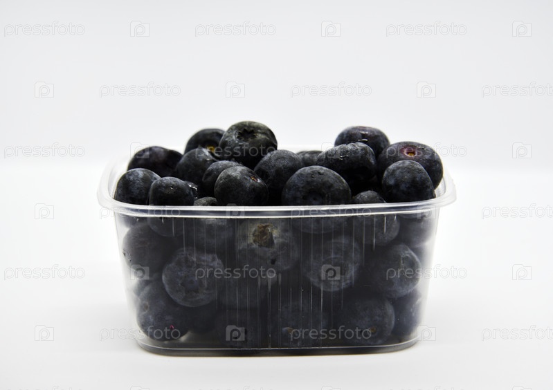 Вкусная и сочная черника в пластиковом контейнере на белом фоне. Черника