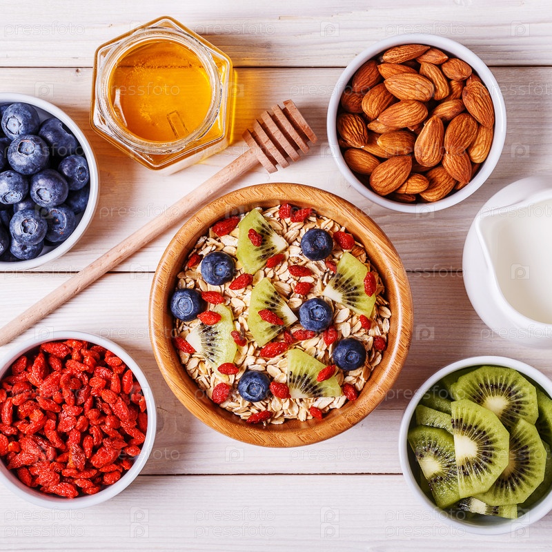 Здоровый завтрак - чаша овсяных хлопьев со свежими фруктами, миндалем и медом