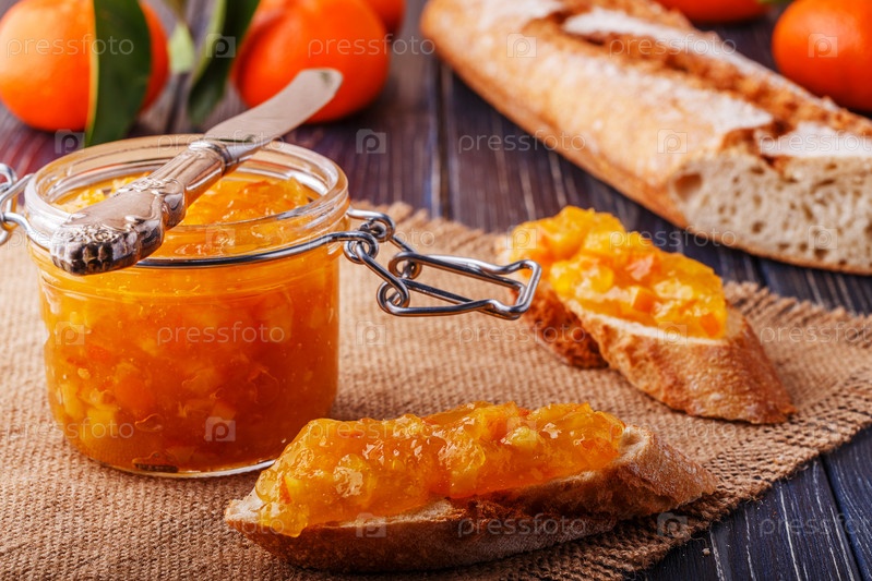 Апельсиновое (мандариновое) варенье в стеклянной банке на столе