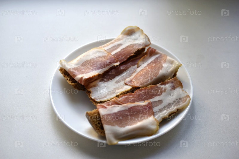 Свежий сочный бекон на кусочке ржаного хлеба