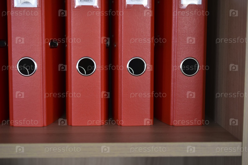 Офисные красные папки на полке в офисе