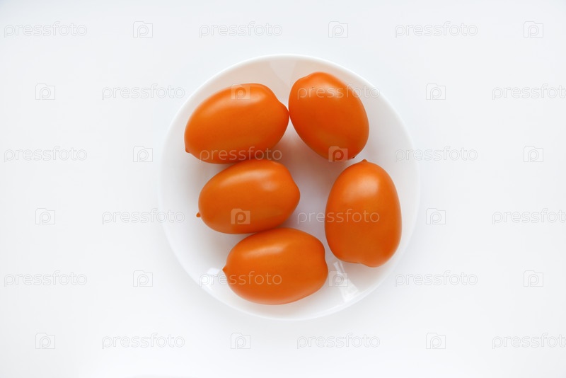 Желтые спелые помидоры на тарелке на белом фоне. Помидоры крупным планом