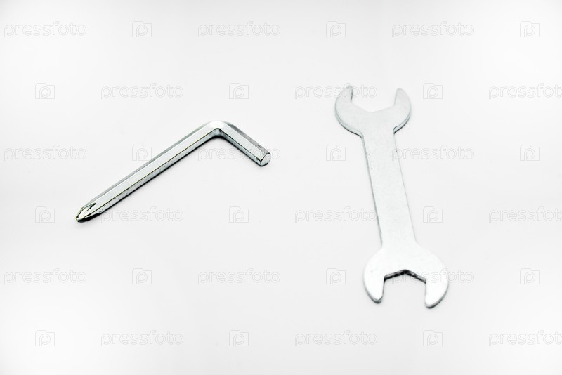 Два железных строительных ключа на белом фоне. Роговой ключ и отвертка