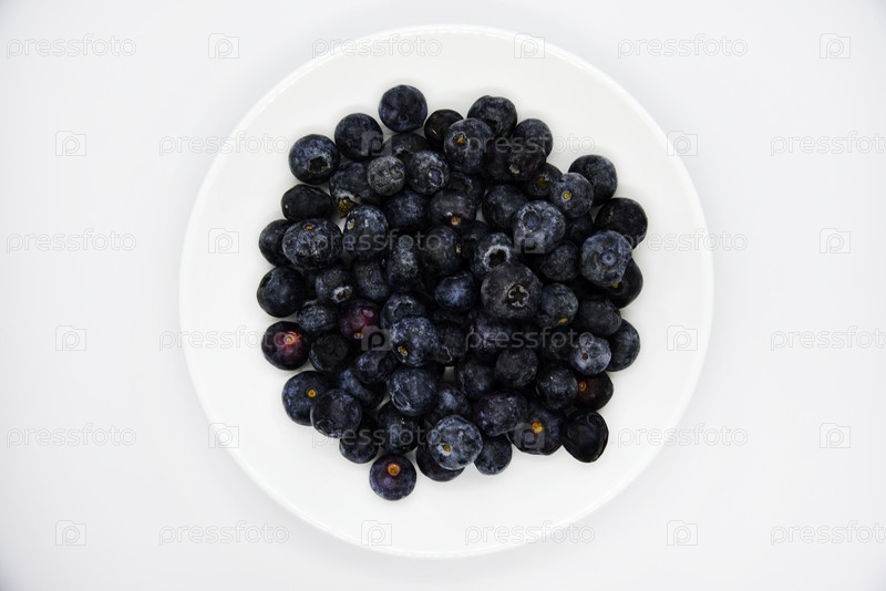 Вкусная и сочная черника на белой тарелке на белом фоне. Большие ягоды черники