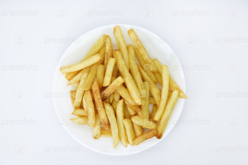 Желтый вкусный картофель фри в белых блюдах. Фаст-фуд на тарелке. Жареная картошка. Поджаренные ломтики картофеля на белом фоне