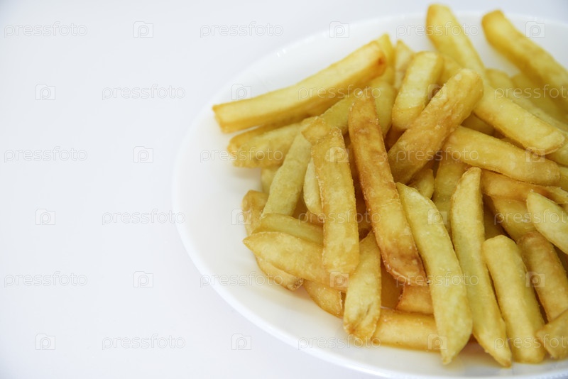 Желтый вкусный картофель фри в белых блюдах. Фаст-фуд на тарелке. Жареная картошка. Поджаренные ломтики картофеля на белом фоне