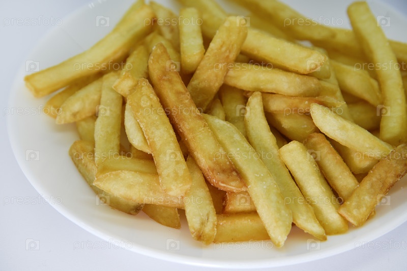 Желтый вкусный картофель фри в белых блюдах. Фаст-фуд на тарелке. Жареная картошка. Поджаренные ломтики картофеля на белом фоне