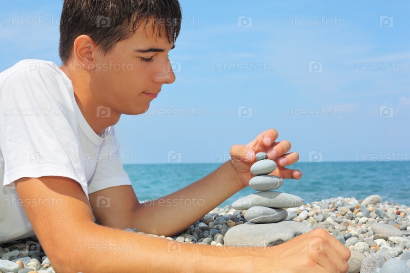 Молодой человек делает пирамиду из гальки