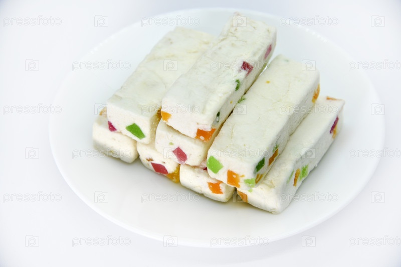 Кусочки сочного зефира на белой тарелке. Сладкая восточная закуска. Сладости к чаю