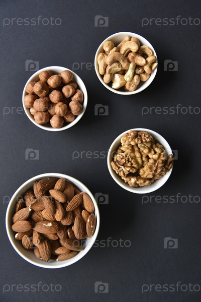 Набор орехов в белых чашках на черном фоне. Арахис, фундук и миндаль. Грецкий орех. Вкусный набор орехов