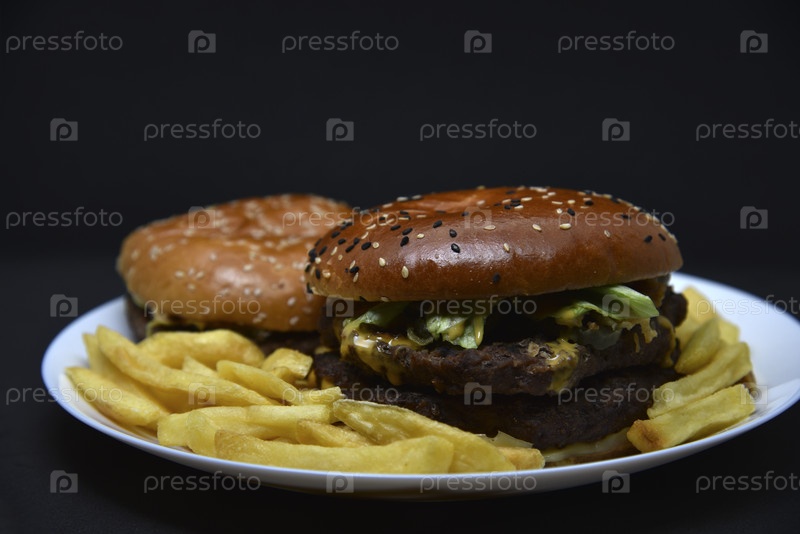 Два гамбургера с мясом и картофелем фри на тарелке. Вкусный фаст-фуд. Гамбургеры