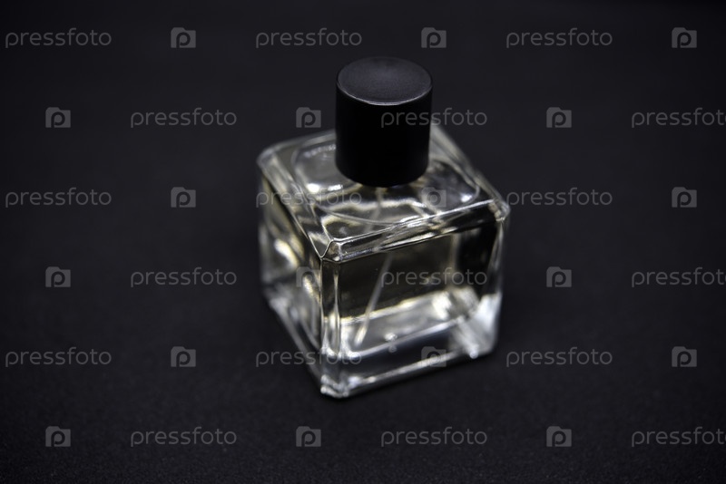 Стеклянный флакон духов на черном фоне. Флакон духов крупным планом. Парфюмерия