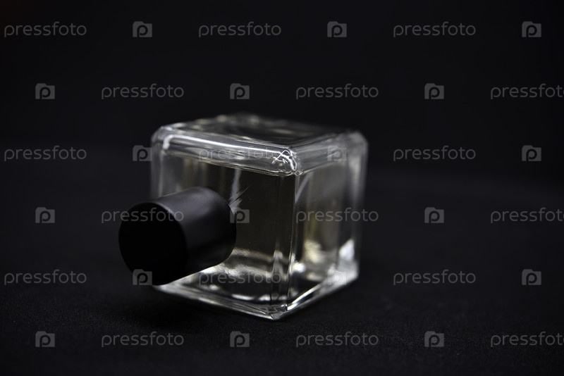 Стеклянный флакон духов на черном фоне. Флакон духов крупным планом. Парфюмерия