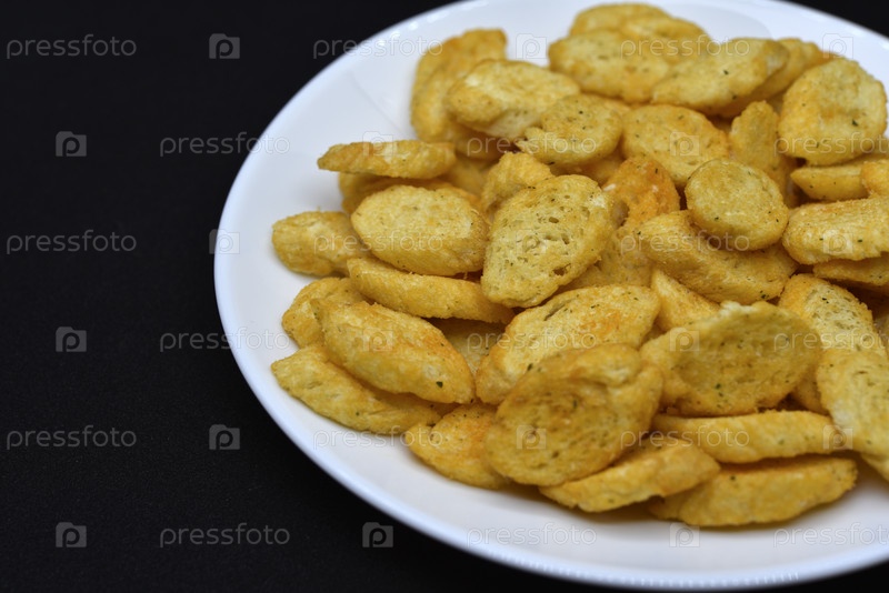 Желтые острые крекеры на белой тарелке. Панировочные сухари к пиву. Закуска