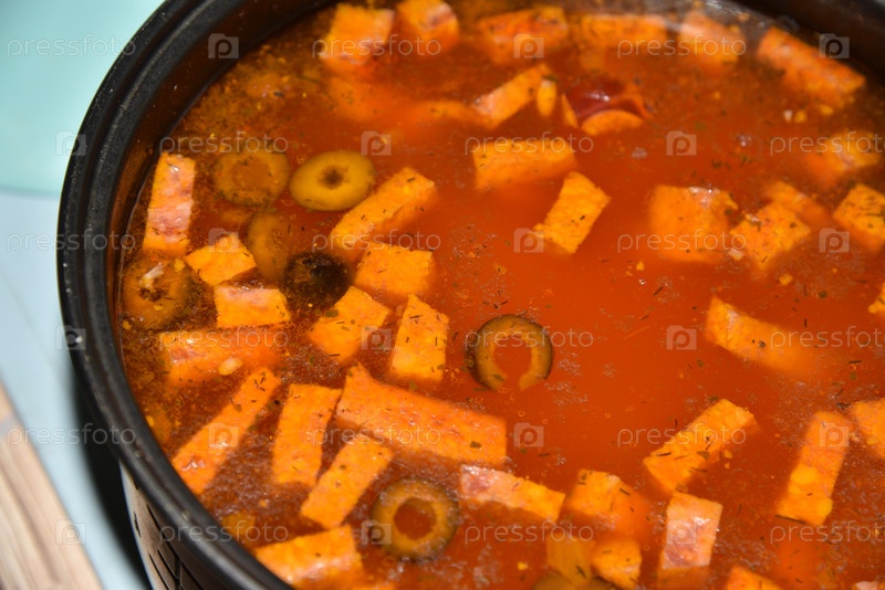 Суп с колбасой в кастрюле. Мясная солянка. Вкусный суп