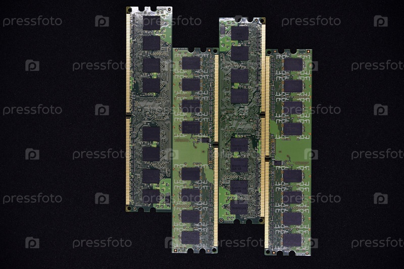 Синие полоски оперативной памяти на черном фоне. Микросхемы памяти компьютера. Компьютерные чипы
