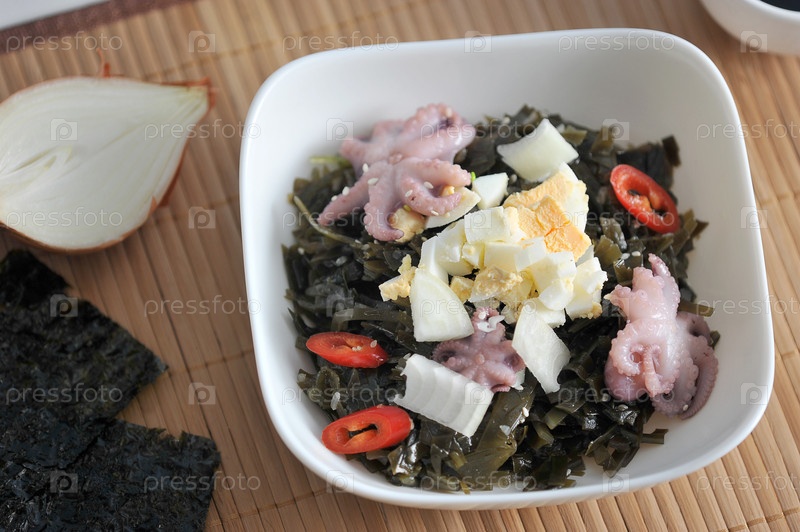Салат из морской капусты, осьминога, яиц и лука