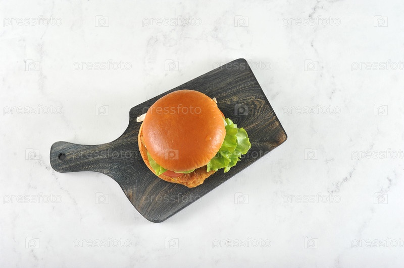 Круглый гамбургер с куриной котлетой на темной деревянной доске