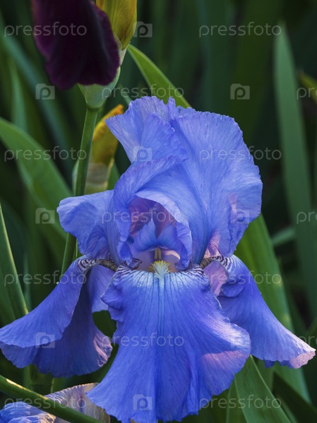 Синий цветок ириса на фоне других цветов в весеннем саду. Крупный план красивого бутона цветка ириса, размытые зеленые листья на заднем плане