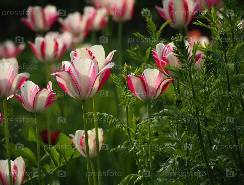 Удивительно красивые цветущие тюльпаны в саду среди пышной зелени. Весенний цветочный фон