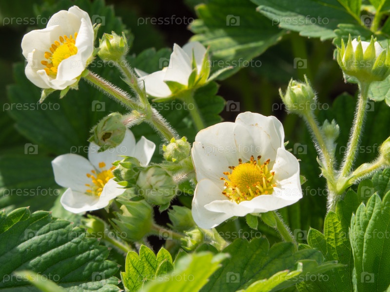 Крупный план маленьких белых цветов в зеленой листве. Цветение земляники садовой макро фото
