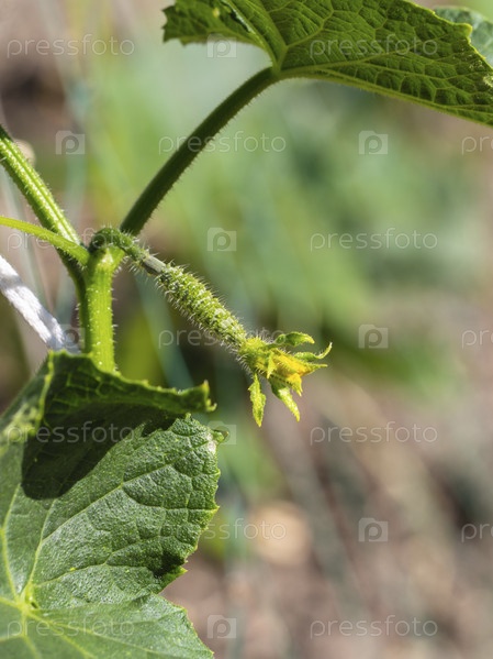 Бутон цветка огурца с маленьким зародышем корнишона в саду, крупный план. Маленький молодой огурец с цветком растет на ветке. Начало роста плодов огурца