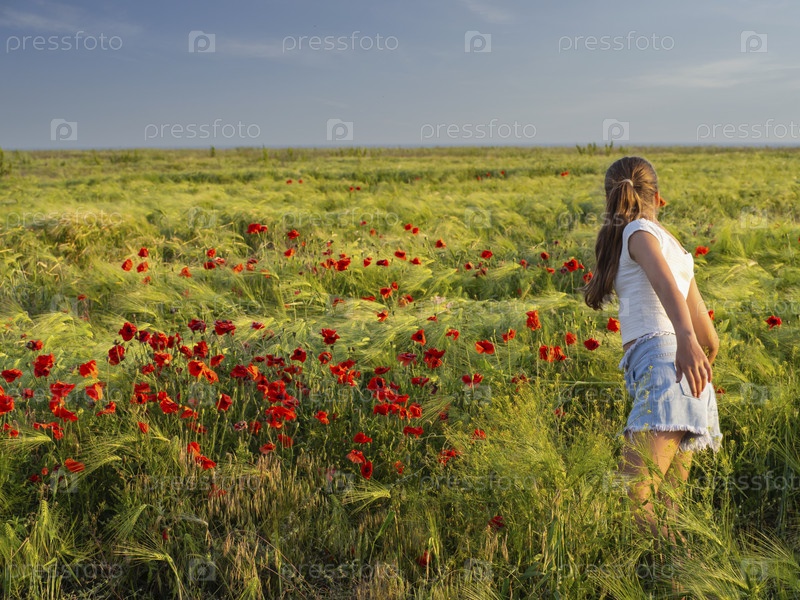 Девушка идет через маковое поле. Вид сзади на девочку-подростка, стоящую на пшеничном поле с красными маками под голубым небом в лучах заката. Летний пейзаж. Теплые цвета