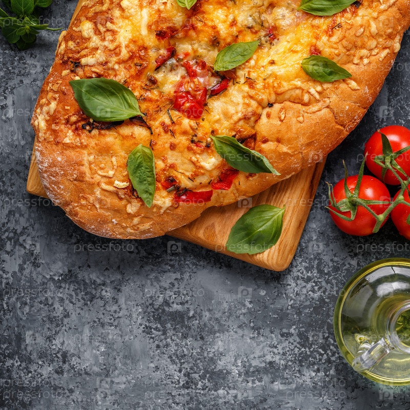 Фокачча с помидорами, зеленью и сыром