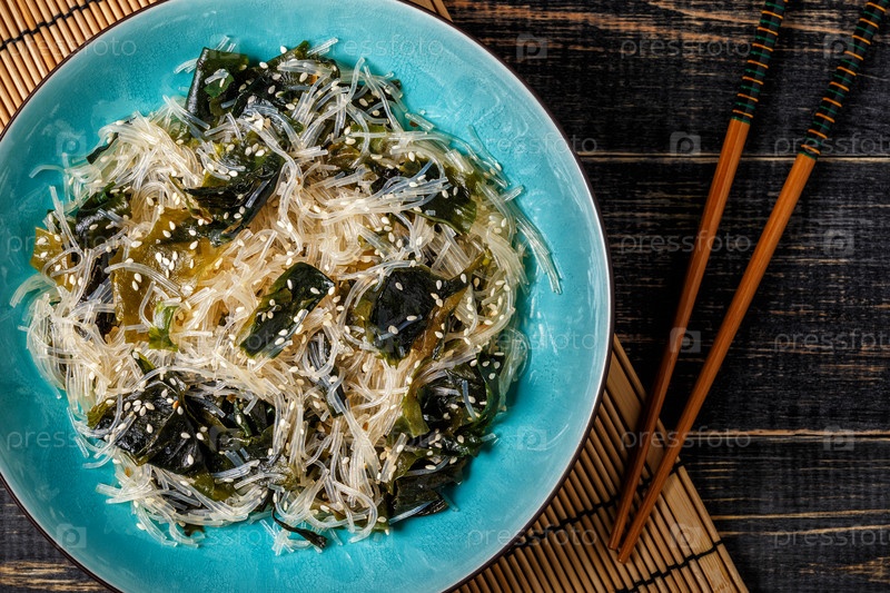Салат из фунчозы с вакаме на темном фоне