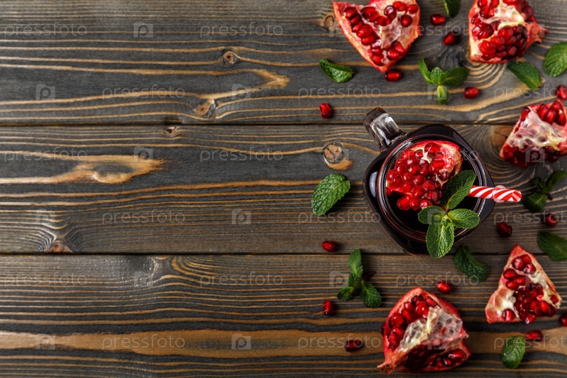 Стакан гранатового сока со свежими фруктами граната и мятой на деревянном столе