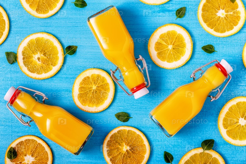 Апельсиновый сок на синем фоне, вид сверху