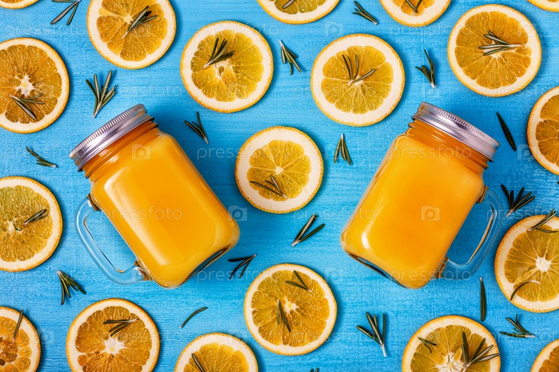 Апельсиновый сок на синем фоне, вид сверху