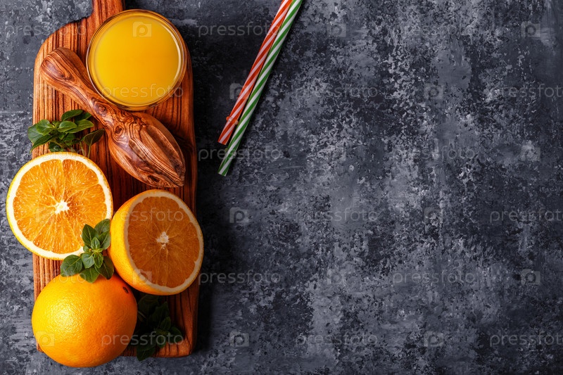 Свежие спелые апельсины и сок на каменном столе