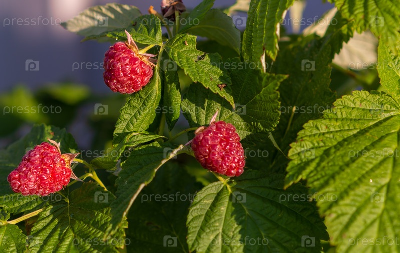 На ветках висят большие спелые красные ягоды сортовой малины