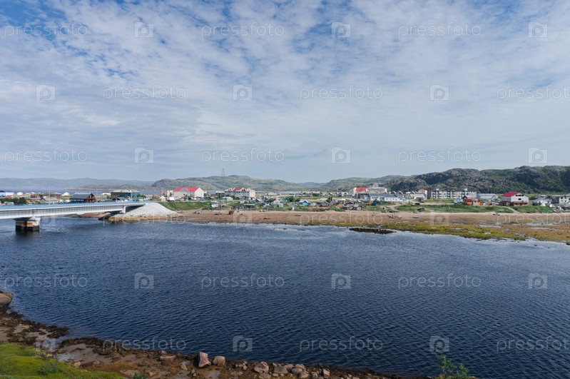 Рыбацкая деревня Териберка, Кольский полуостров, Мурманская область, Россия. Общий вид северной деревни леом