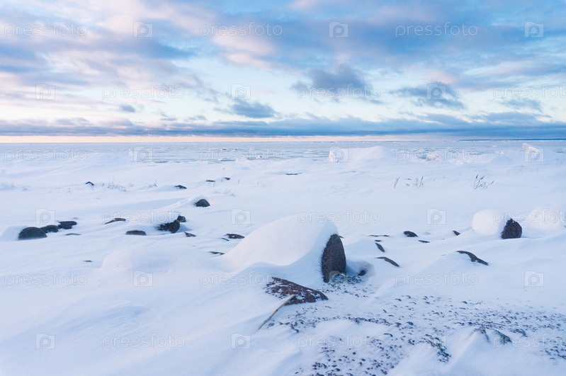 Замерзшее море под снегом на закате зимой. Снежный пейзаж, красивое небо