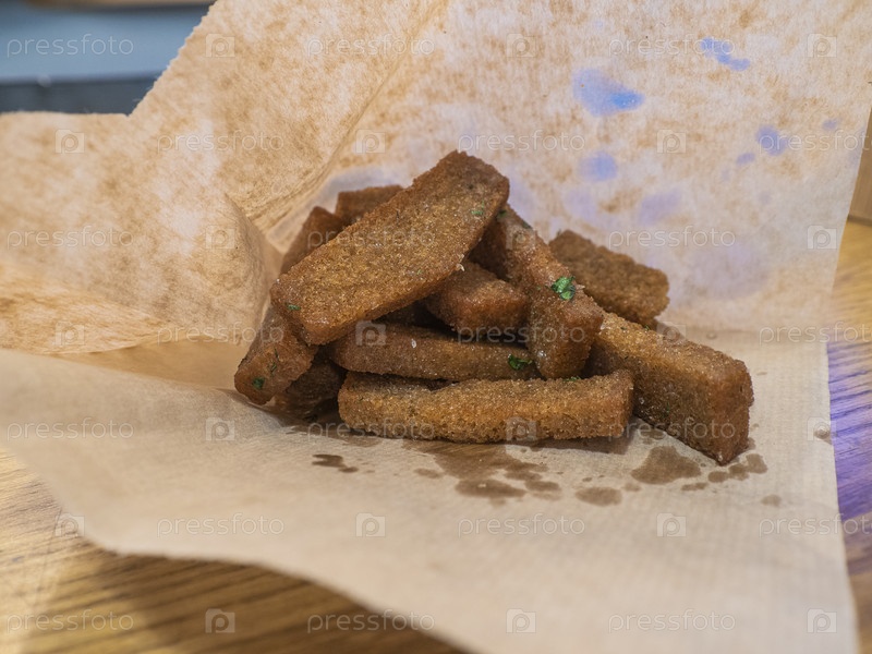 Поджаренные чесночно-ржаные гренки в оберточной бумаге, уличная еда