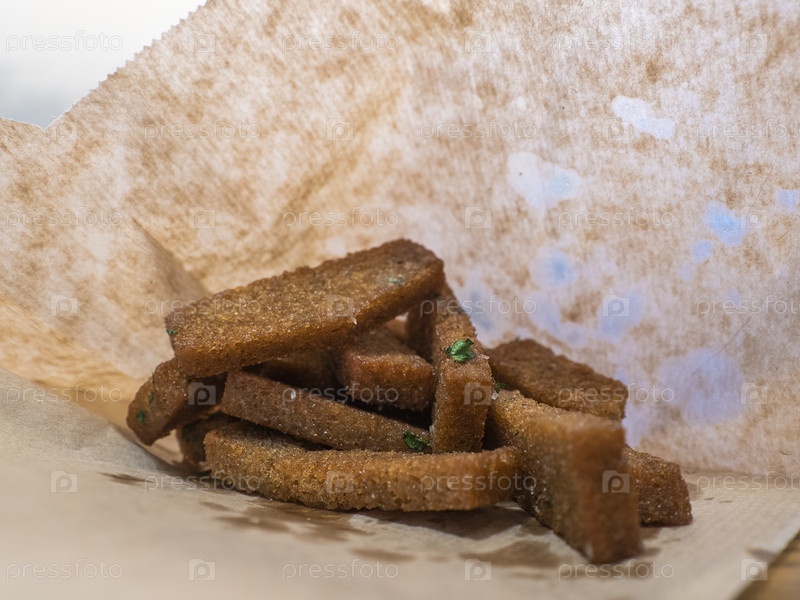 Поджаренные чесночно-ржаные гренки в оберточной бумаге, уличная еда