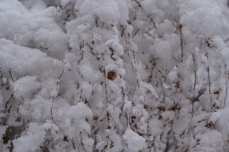 Ветки кустарника засыпаны снегом