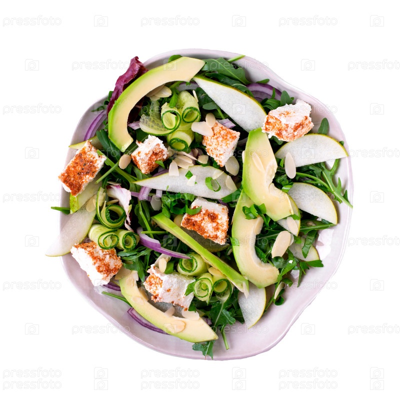 Изолированный салат с авокадо, грушей, огурцом, мягким сыром и рукколой подается на керамической тарелке на белом фоне. Вид сверху
