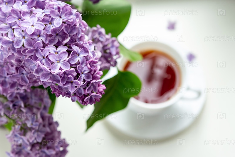 Домашний интерьер с букетом цветущих сиреневых цветов на окне. Чаепитие весенним утром на кухне у окна