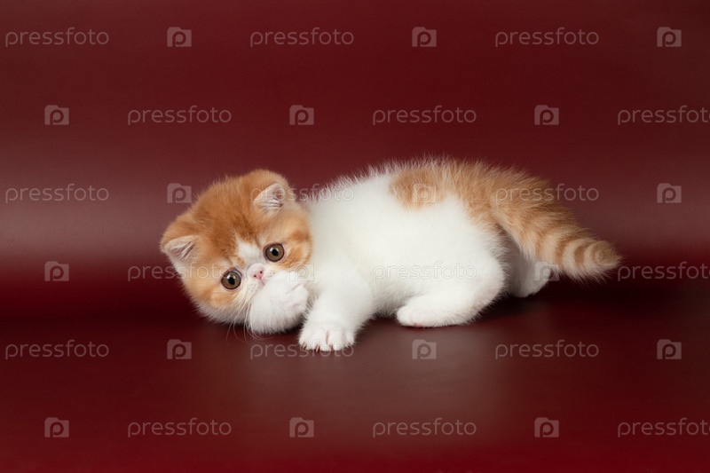 Маленький красивый рыжий котенок экзотический на бордовом фоне в студии