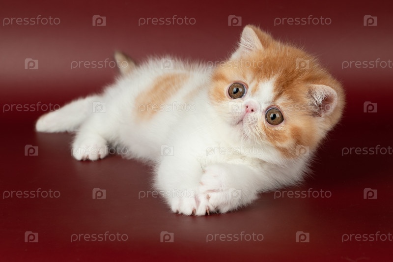 Маленький красивый рыжий котенок экзотический на бордовом фоне в студии