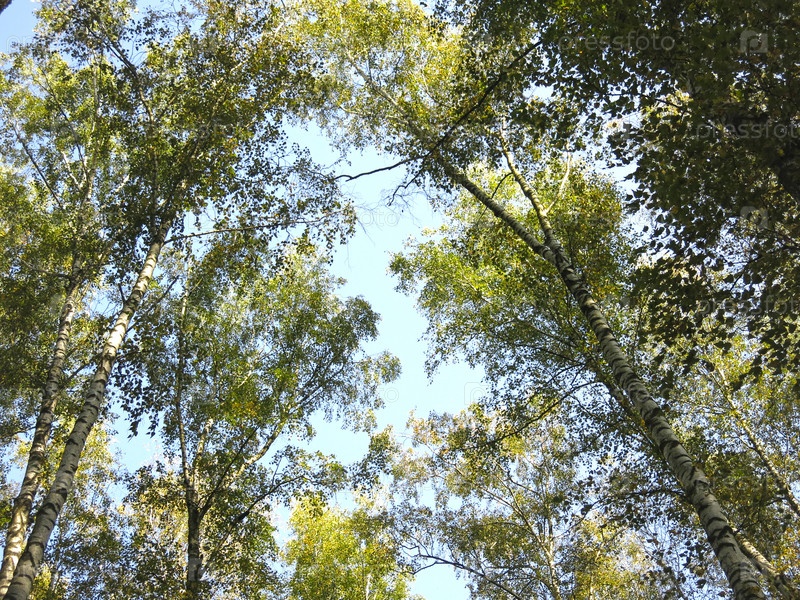 Березы весной в роще покрываются молодой зеленью на фоне ясного неба